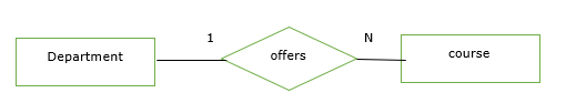 The department offers multiple courses and each course belongs to only one department, hence cardinality between department and course if one to many.